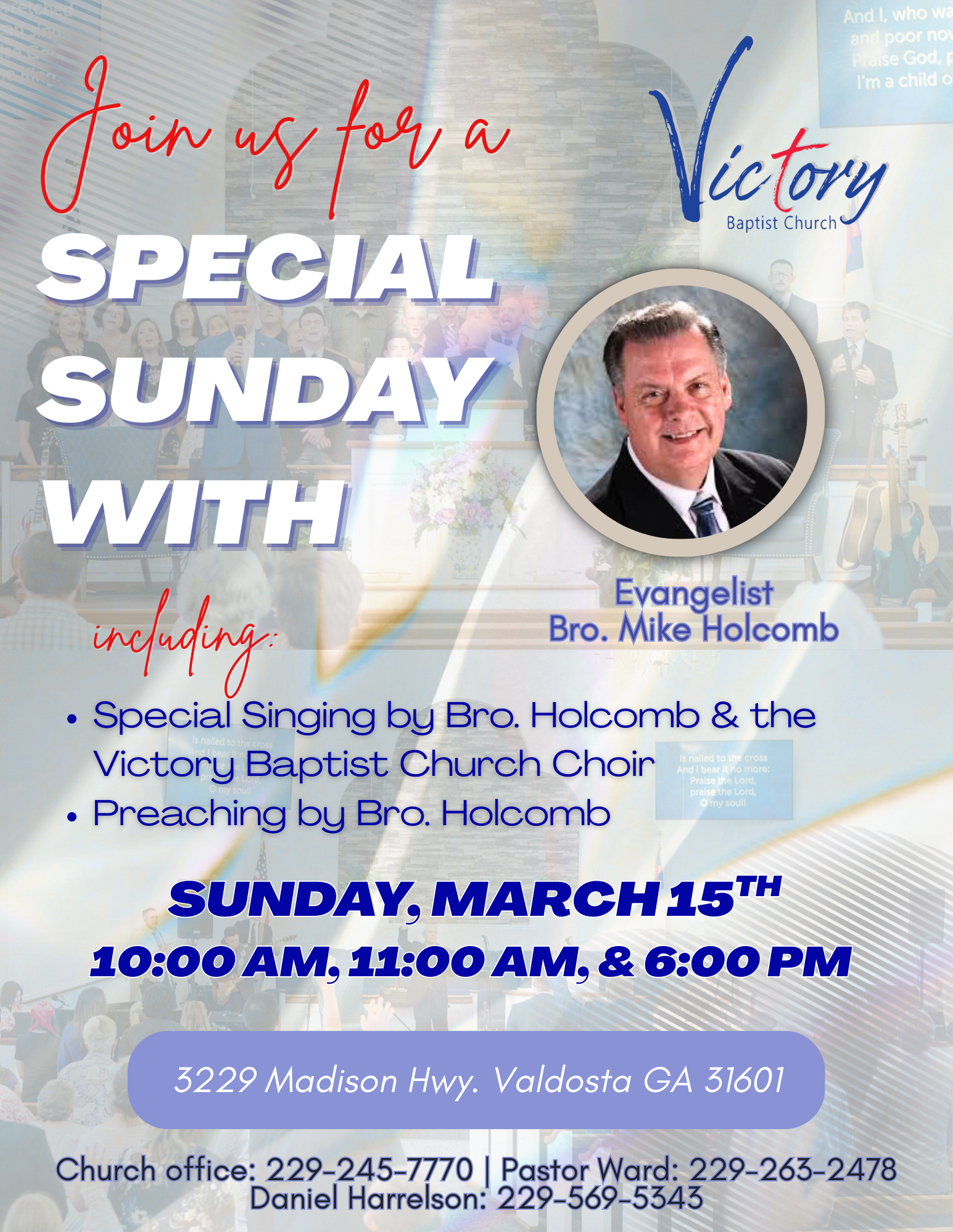 Sunday School begins at 10 am, followed by our main service at 11 am and 6 pm with special singing by the victory baptist church choir.